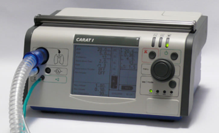 Both invasive ventilation (e.g. via tracheostoma) and non-invasive ventilation (via a ventilation mask) are possible. CARAT I provides the technical features required for operation with a single line patient circuit. The system can be connected to a low-pressure gas source for ventilation with an increased oxygen concentration. In addition, it is also possible to combine CARAT I with a humidifier.