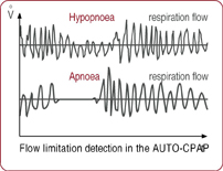 The device continuously calculates the respiration volume per minute. A reduction of the respiration volume per minute indicates hypopnea, in addition an absence of change in the flow signal indicates apnea.